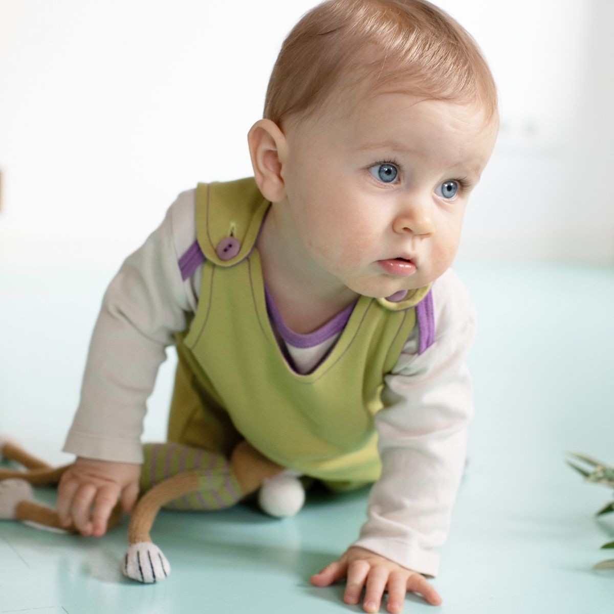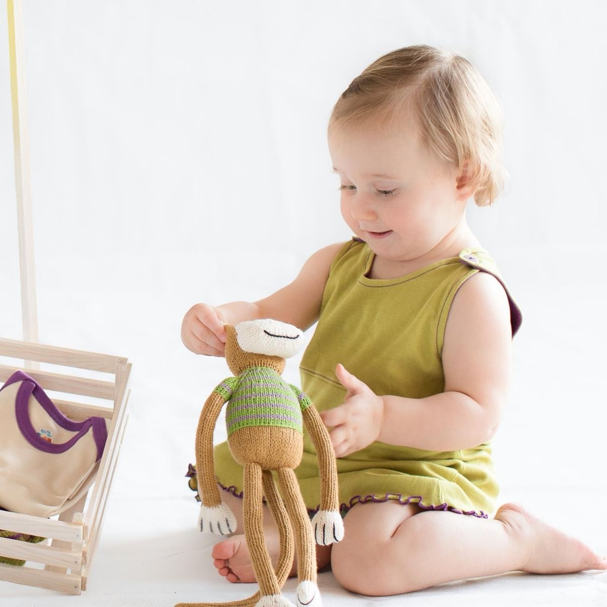 Im Sommer ziehst du das niedliche Äffchen-Kleid über Windel und Body, im Winter kommt noch Langarmshirt und Strumpfhose hinzu. Beim Design wurde bewusst auf Rüschen verzichtet. Entstanden ist ein minimalistisches Kleid, das zuckersüß aussieht, herrlich bequem ist und durch seinen natürlich seidig schimmernden Glanz, dem Ringelsaum, der Äffchen Stickerei und den Smartie-Knöpfen doch zu einem echten Hingucker wird.