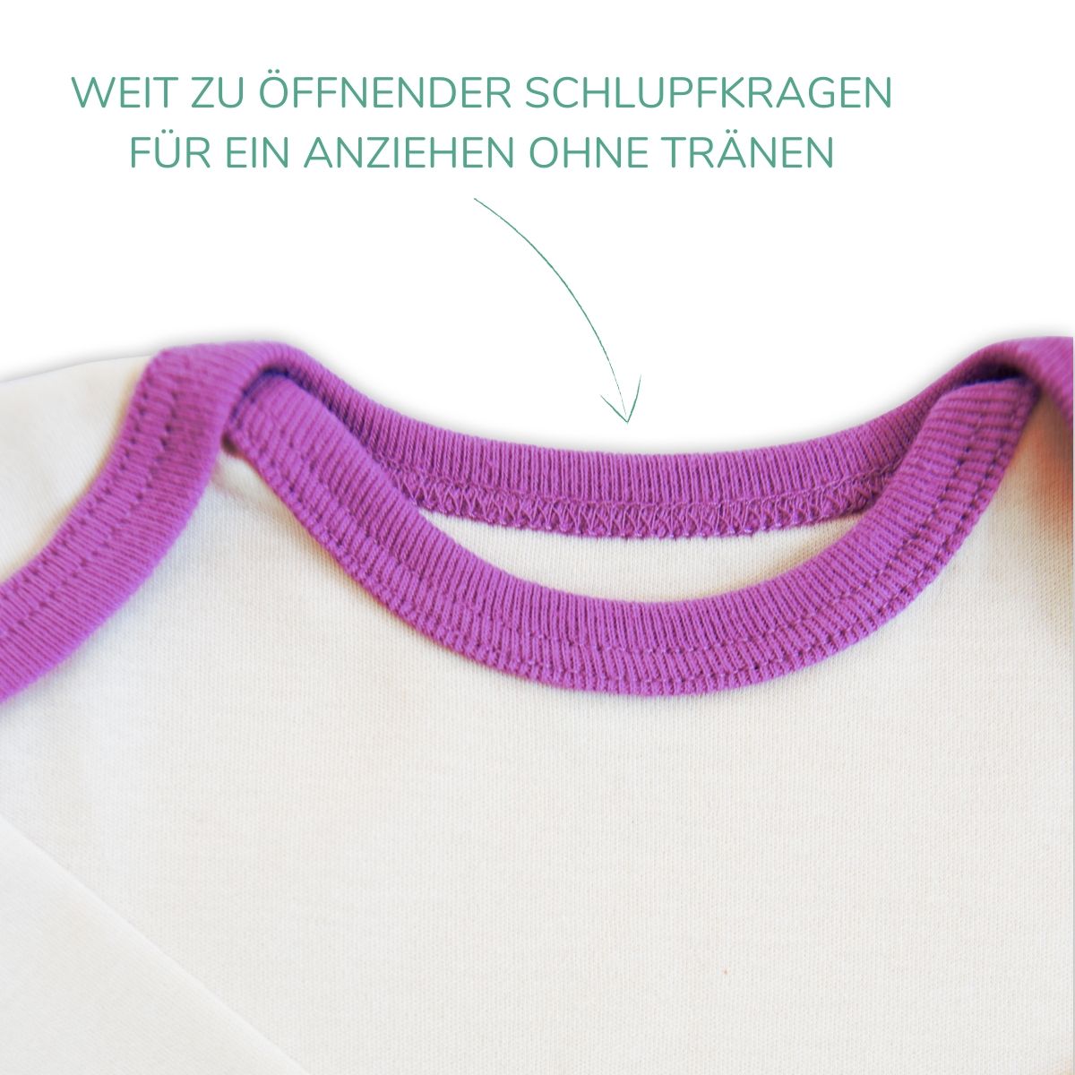 Bio Babyshirt in Natur mit Einfassung in Grün, Lila oder Hellblau. Für ein entspanntes Ankommen sorgen:
