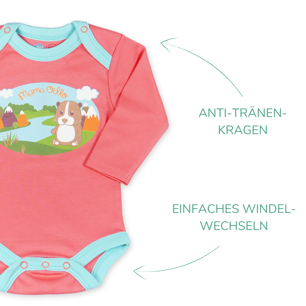 Dieser Body wurde bewusst so entwickelt, dass sich der Kragen über die vorhandenen Druckknöpfe sehr weit öffnen lässt. So lässt sich der Bio Body in Sekundenschnelle über das Köpfchen legen. Zusätzlich sorgen die nickelfreien Knöpfe dafür, dass der Body selbst bei häufigem Öffnen und Schließen nicht ausdehnt und den Brustbereich stets schützend bedeckt.