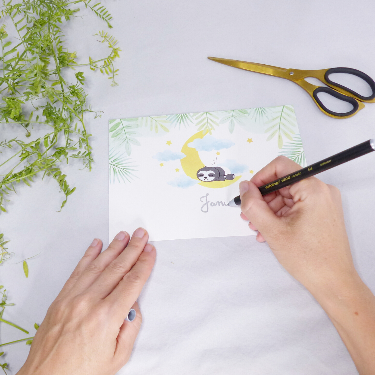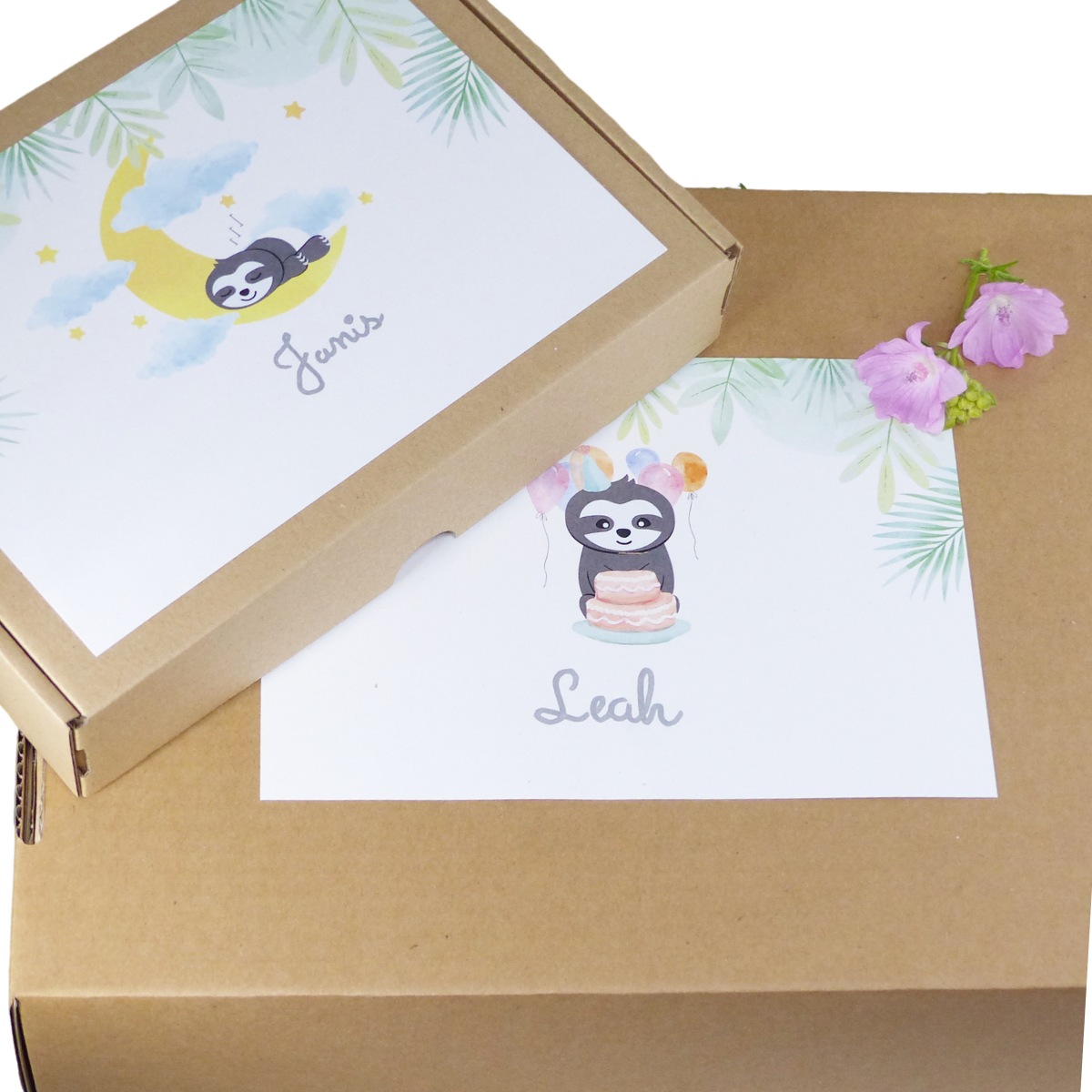 Auf dem Deckel der Geschenkbox befindet sich eine süße Faultier-Grafik (Faultierträume oder Faultier Party). In den Freiraum unterhalb der Faultier-Grafik schreiben wir auf Wunsch in Schönschrift mit Silberstift den/die Namen des/der Beschenkten.